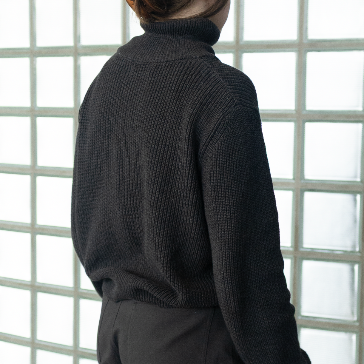 Chunky jumper in very soft cotton/wool blend. Ribbed knit construction with melange yarn for a textural effect. Dropped shoulders and long turtleneck for a cozy fit.