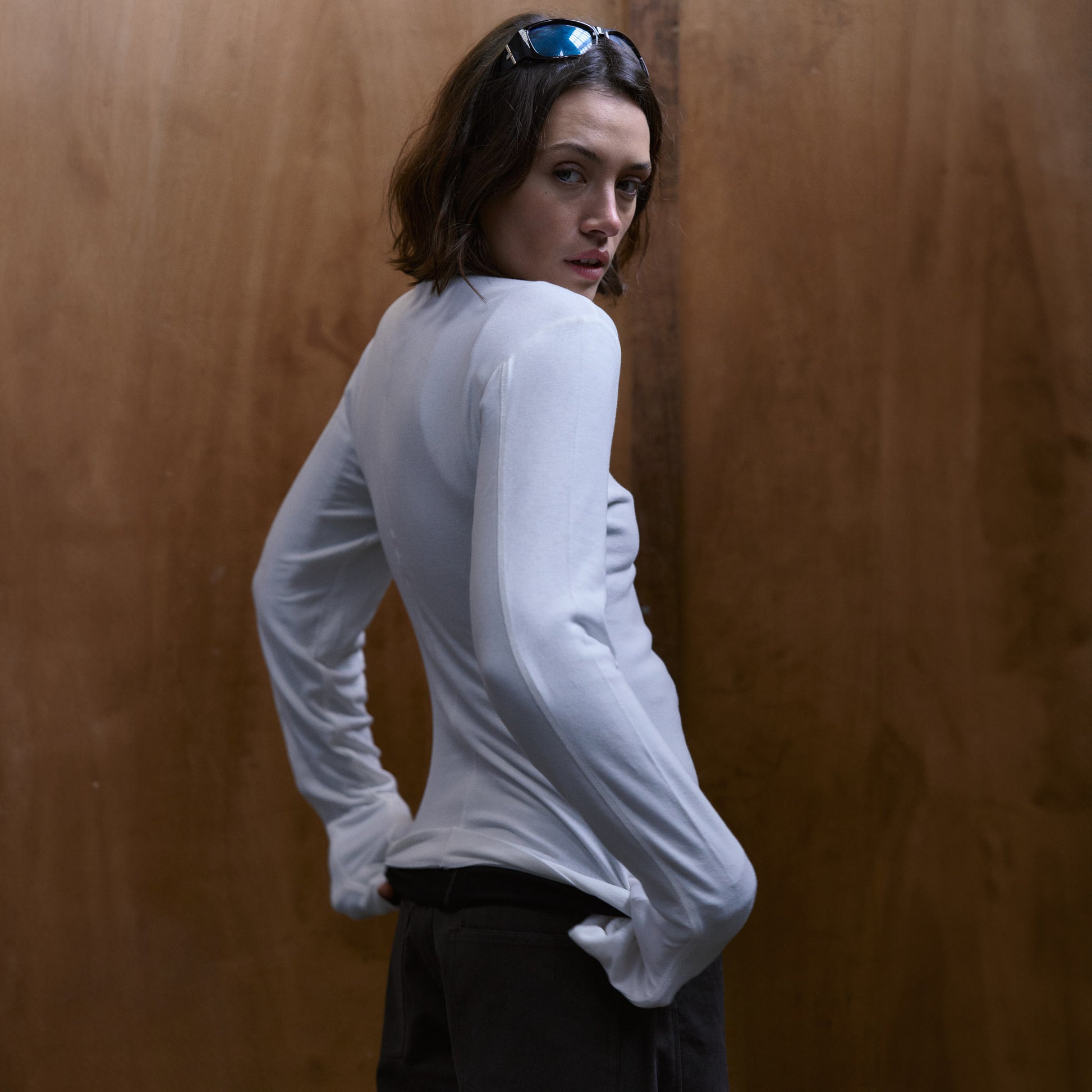 Crafted from ultra-fine, soft ribbed cotton jersey, the Edie Longsleeve is designed in a relaxed fit with extra-long sleeves and a classic round neckline. Lock-seam detailing runs along the center front, center back, and sleeves, adding a subtle architectural touch. An effortless wardrobe staple - the perfect long-sleeved tee made from exceptionally soft cotton jersey.