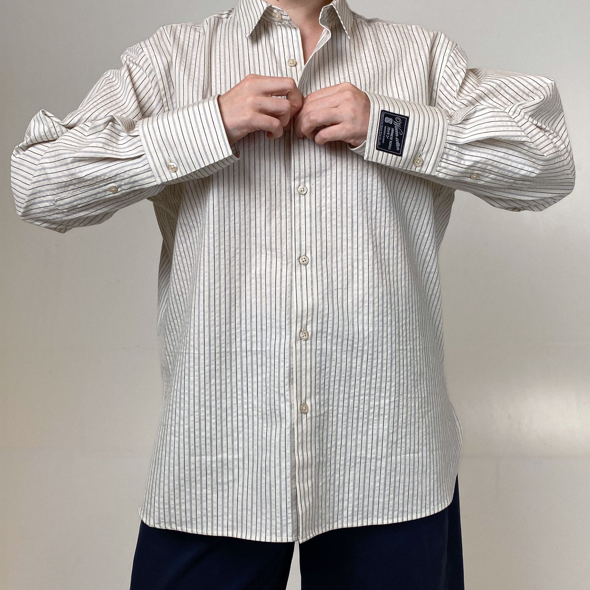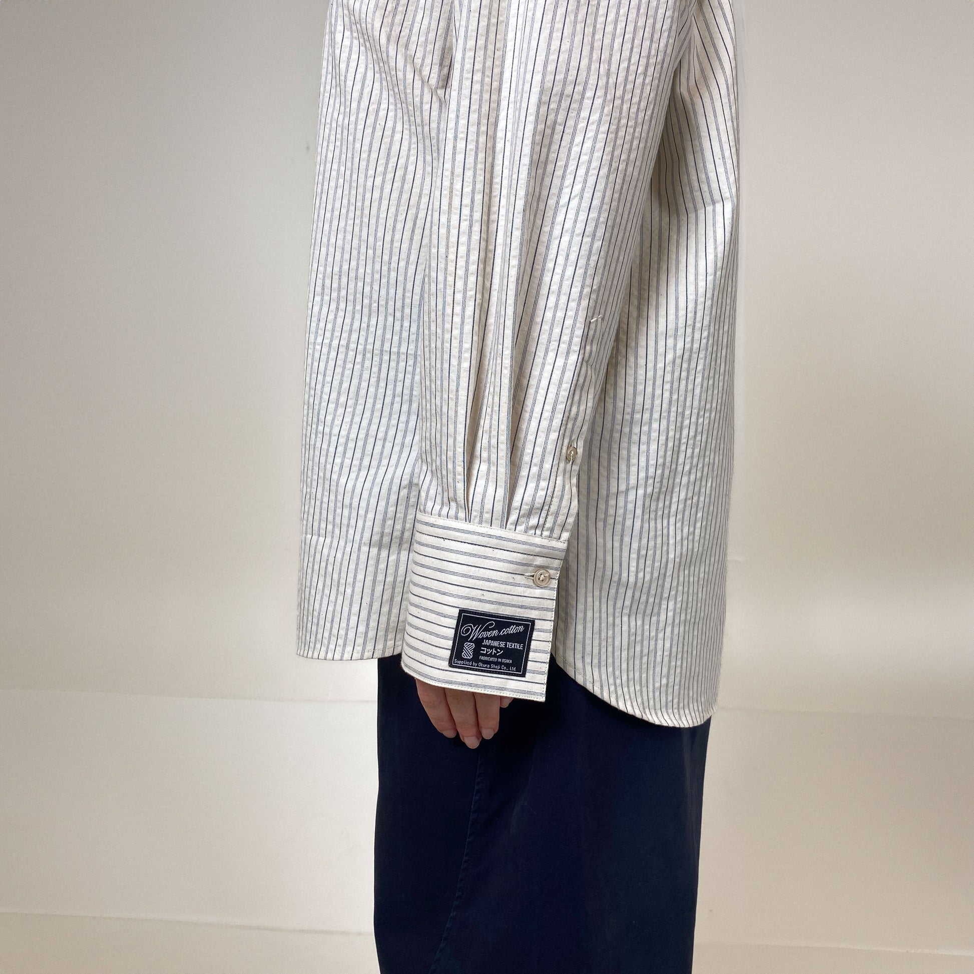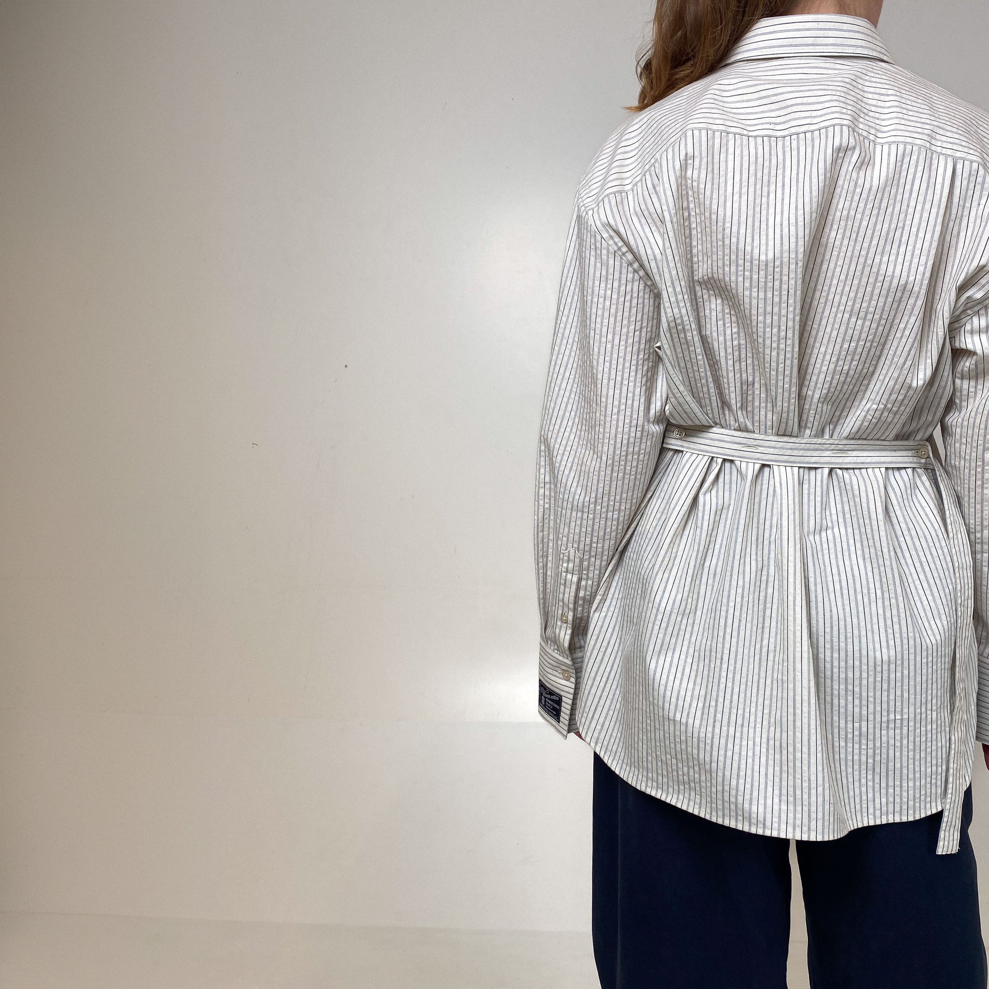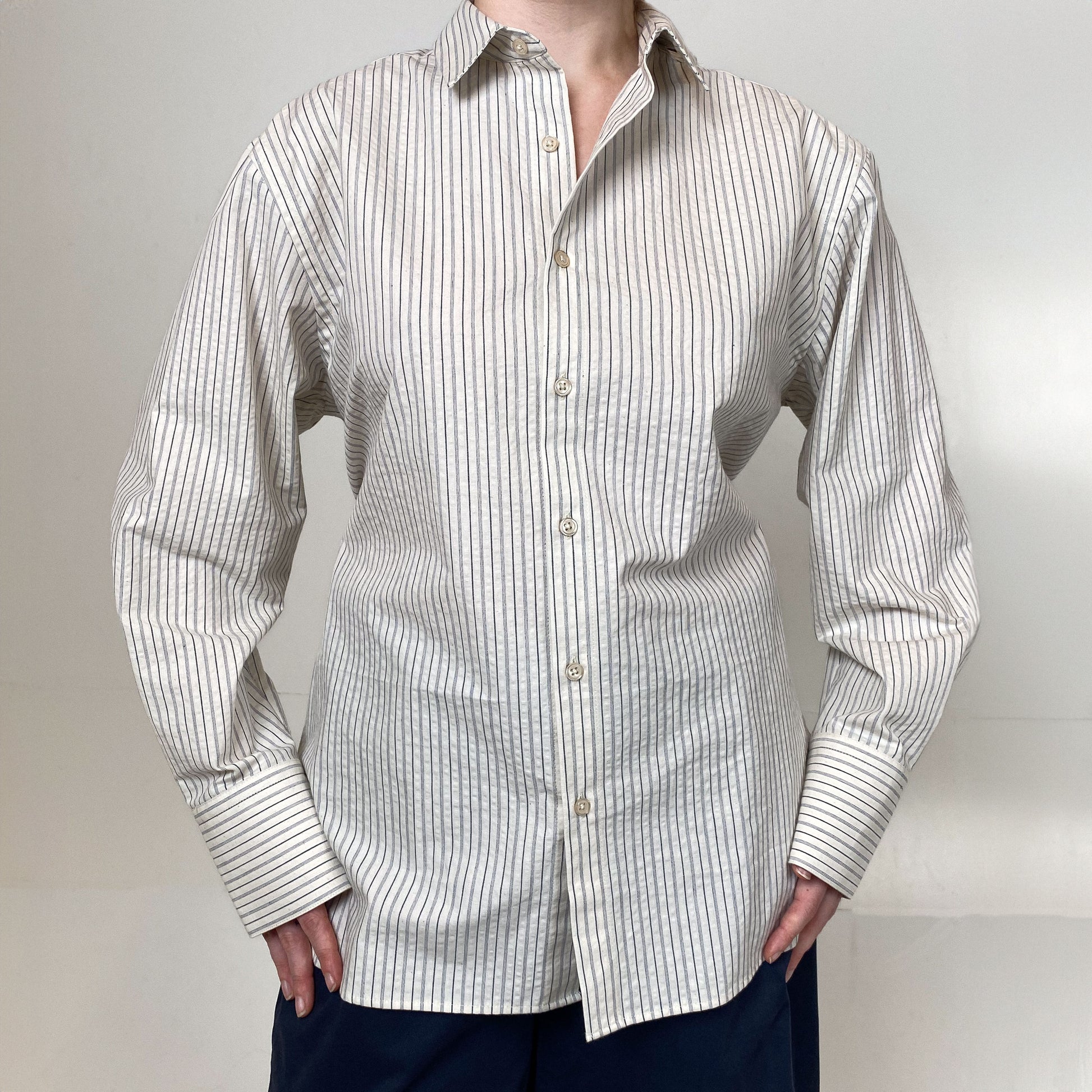 Oversized button-up shirt in soft Japanese cotton with indigo stripes. The detachable placket piece can be used to gather the back for multiple styling options. Features long cuffs with signature embroidered label, highlighting the fabric make and origin. Unisex and essential!
