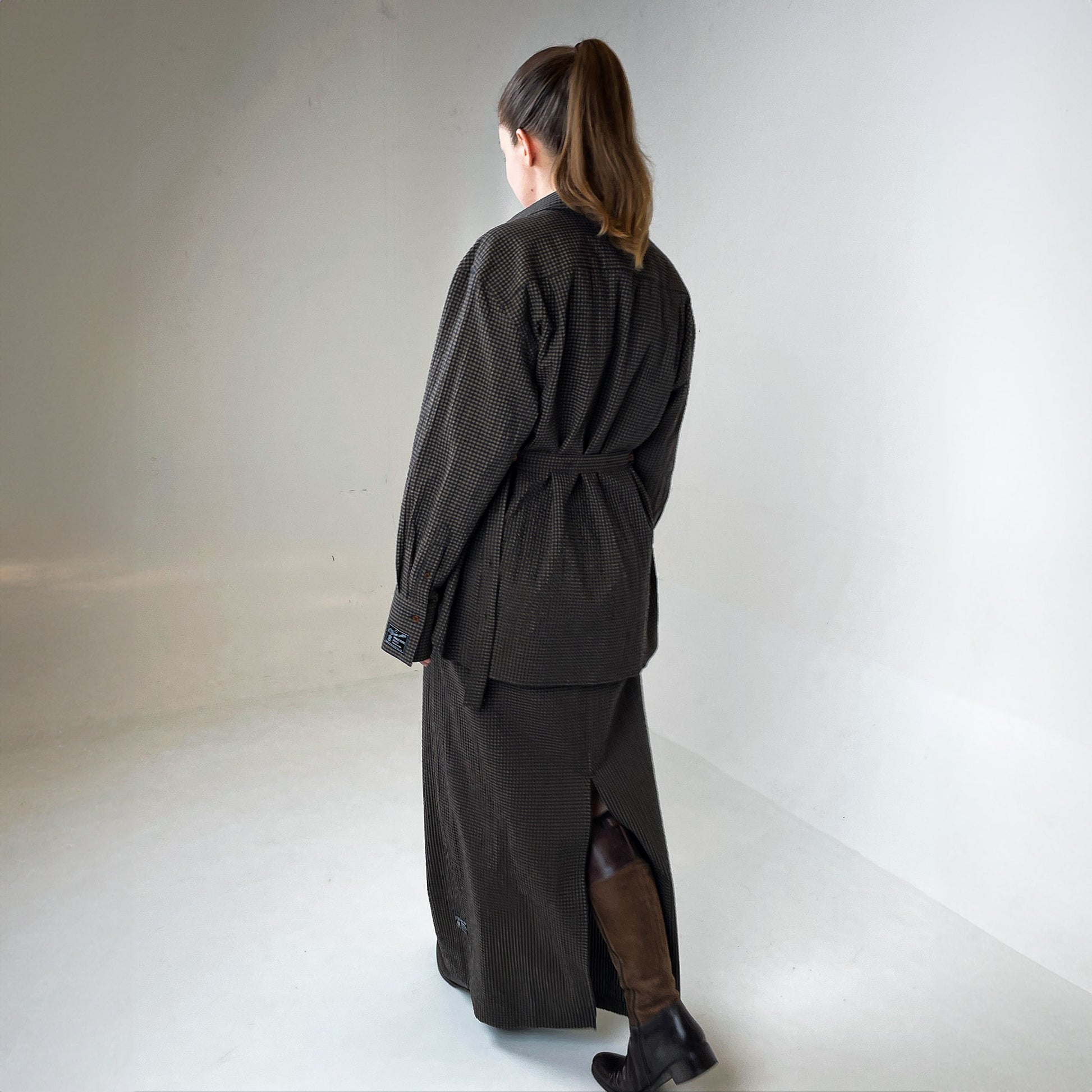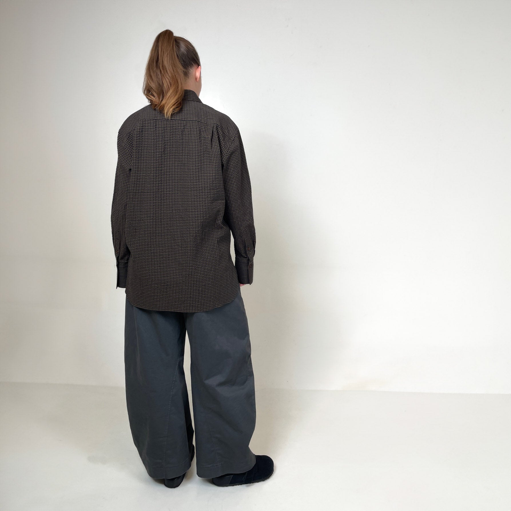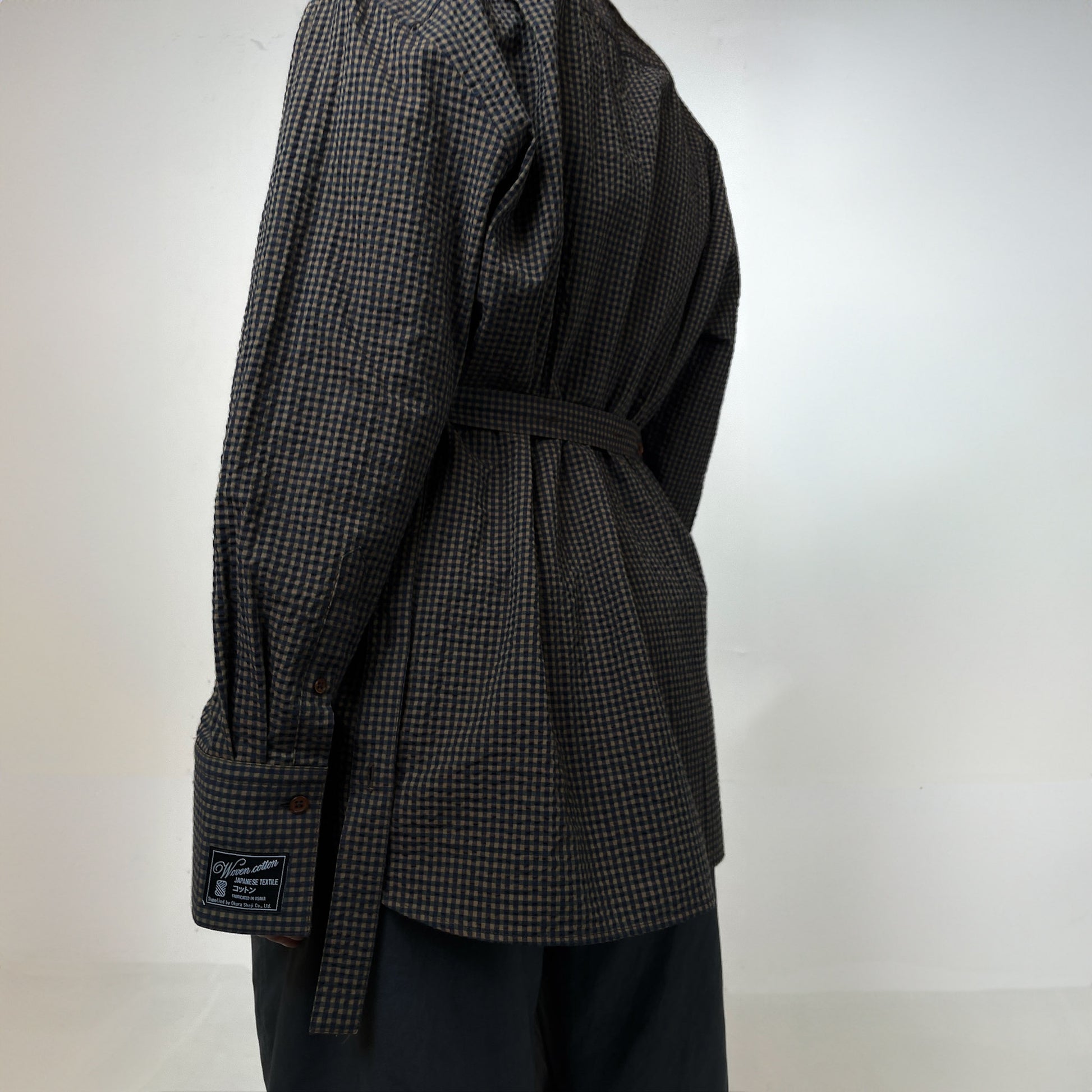 Oversized button-up shirt in a Japanese gingham seersucker. The detachable placket piece can be used to gather the back for multiple styling options. Features long cuffs with signature embroidered label, highlighting the fabric make and origin. Unisex and essential!