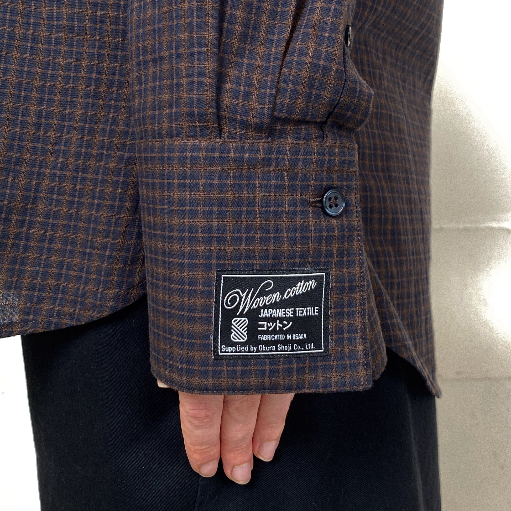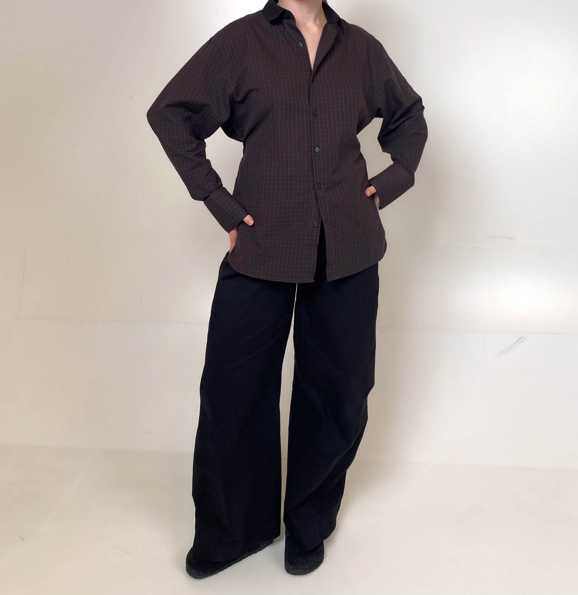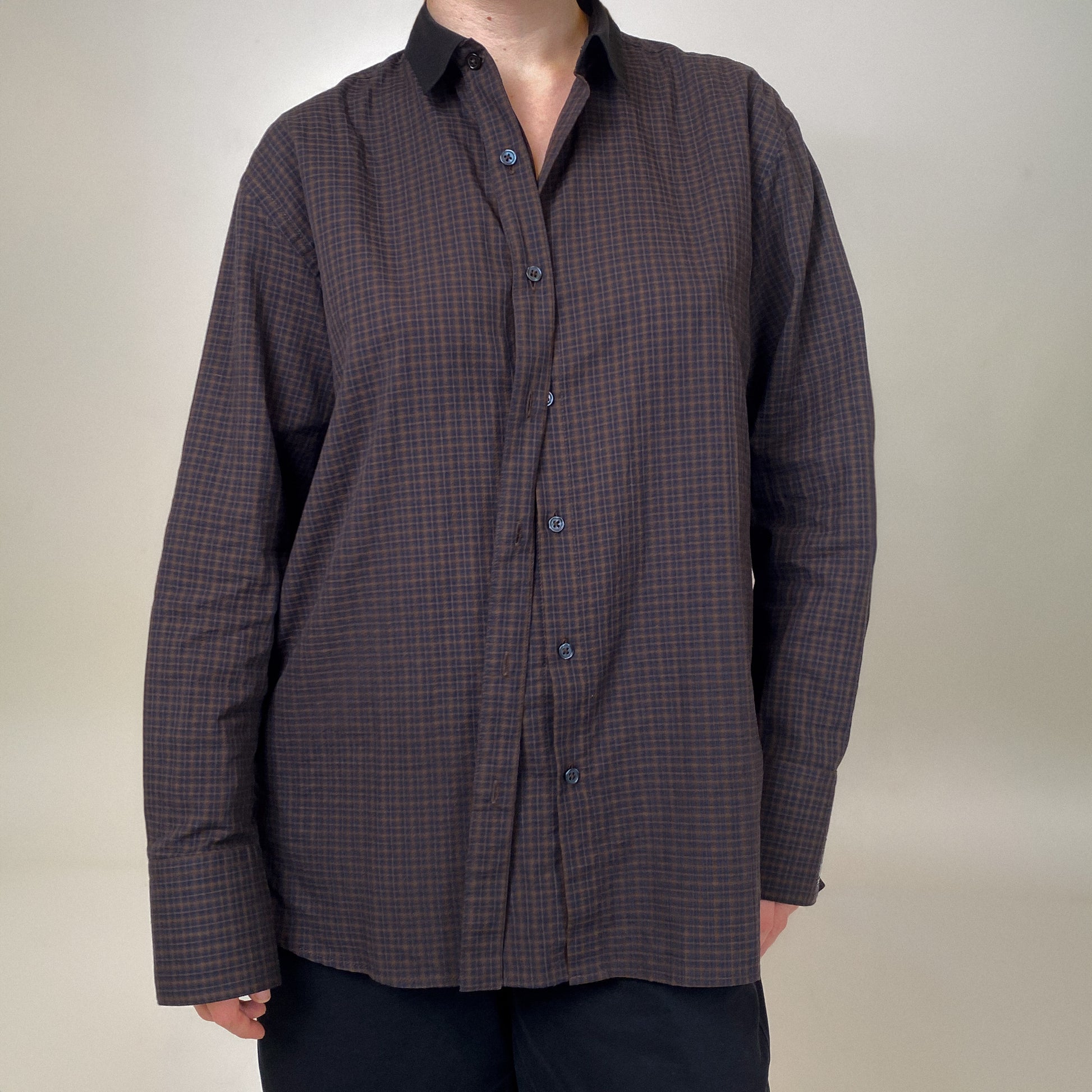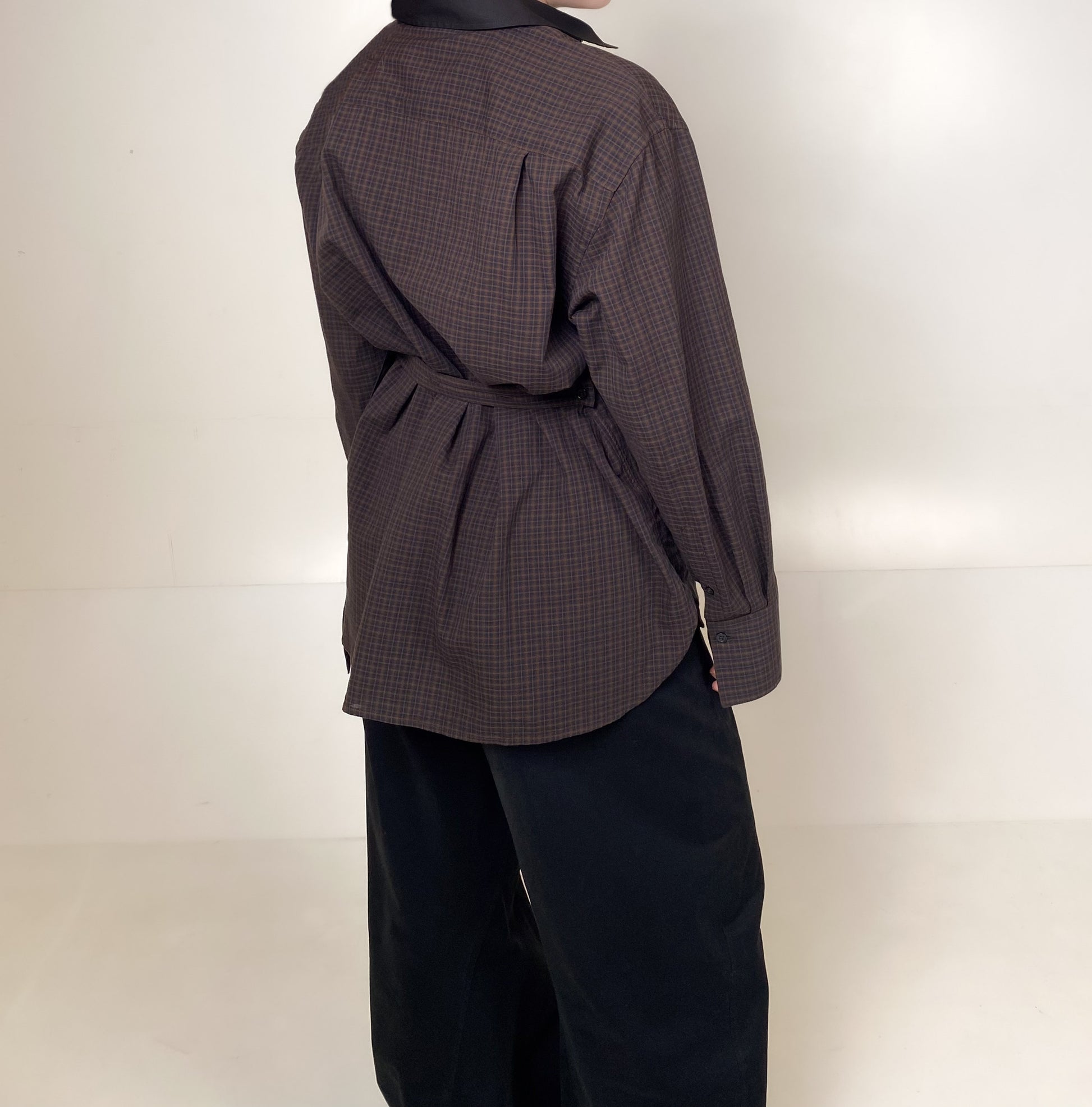 Oversized button-up shirt in a Japanese dobby woven checked cotton. The detachable placket piece can be used to gather the back for multiple styling options. Features long cuffs with signature embroidered label, highlighting the fabric make and origin. Unisex and essential!